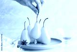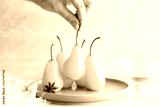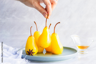 Pear confit.Vegetarian dessert. Caramelized pear in the oven is poured with agave syrup and honey.Cooking fruit dessert.Sweet, juicy pear with jam.Baked pear in a bowl on the table. Caramelized fruit
