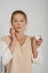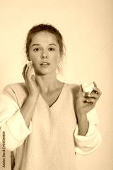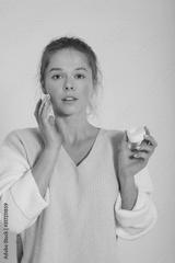 Minimalistic portrait of a young beautiful joyful attractive woman.