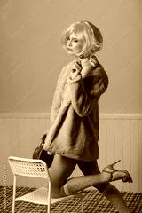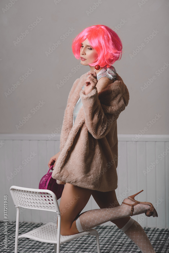Young attractive woman in a bright pink wig, golf and faux fur coat.