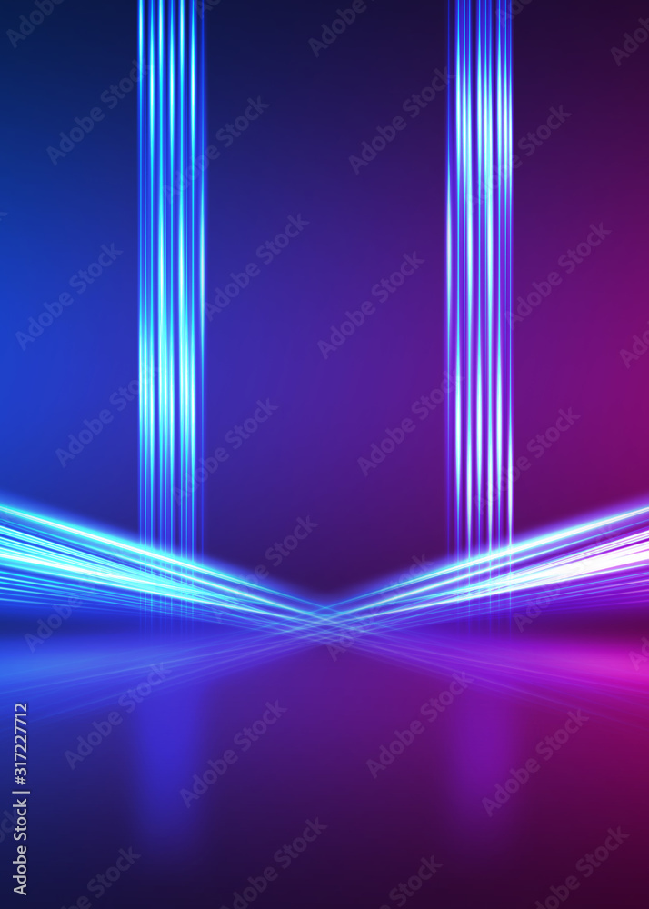 Abstract dark background with blue and pink neon glow. Neon luminous figure in the center of the stage.