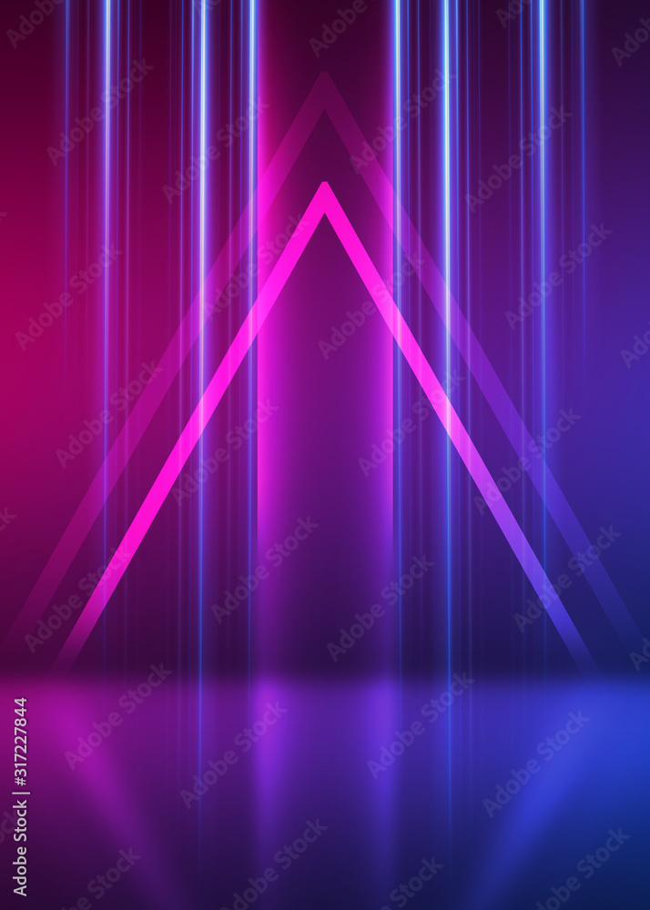 Abstract dark background with blue and pink neon glow. Neon luminous figure in the center of the stage.