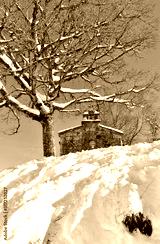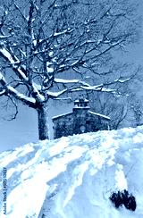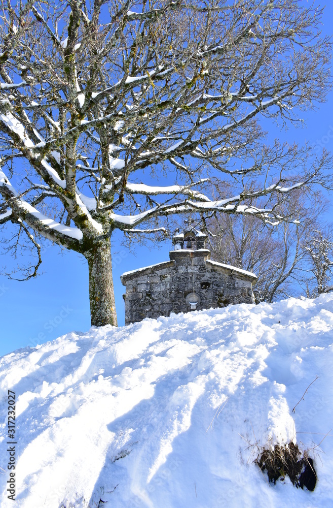 Mountain church Ermita de San Lorenzo after a snowfall with trees and blue sky. Piornedo Village, Ancares, Lugo, Galicia, Spain.