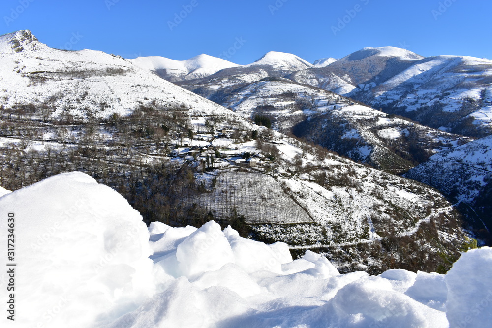 Winter landscape with snowy mountains and small village on a slope with blue sky. Ancares, Lugo, Galicia, Spain.