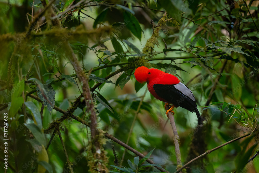 Andean Cock of the Rock - Rupicola peruviana, iconic colored bird from Andean mountains, Mindo, Ecuador.