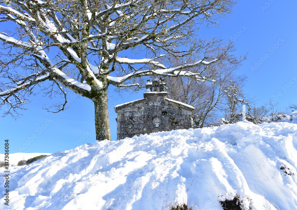 Mountain church Ermita de San Lorenzo after a snowfall with trees and blue sky. Piornedo Village, Ancares, Lugo, Galicia, Spain.