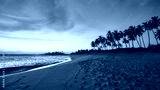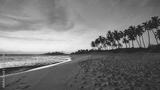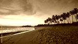 Tropical beach with coconut palm trees silhouettes at sunset.