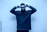Handsome hipster guy with beard wearing blue blank sweatshirt with space for your logo or design. Mockup for print