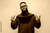 Handsome hipster guy with beard wearing blue blank sweatshirt with waist bag. Mockup for print