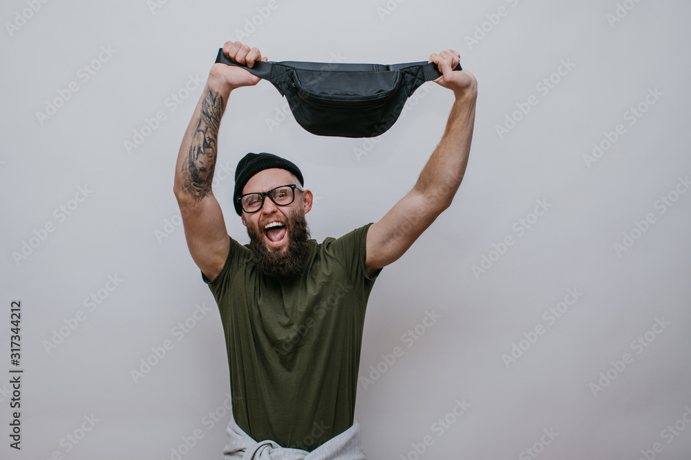 Handsome hipster guy with beard wearing blank t-shirt with waist bag. Mockup for print