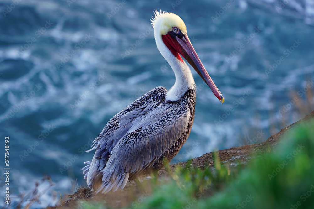 View of wild brown California pelicans (Pelecanus occidentalis californicus) in the La Jolla cove near San Diego, California