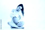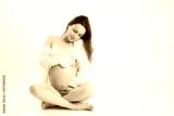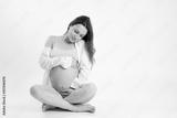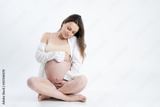 Happy attractive pregnant girl in white shirt sitting on the ground and holds her hands on her swollen belly, isolated over white background, copyspace