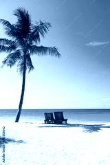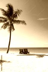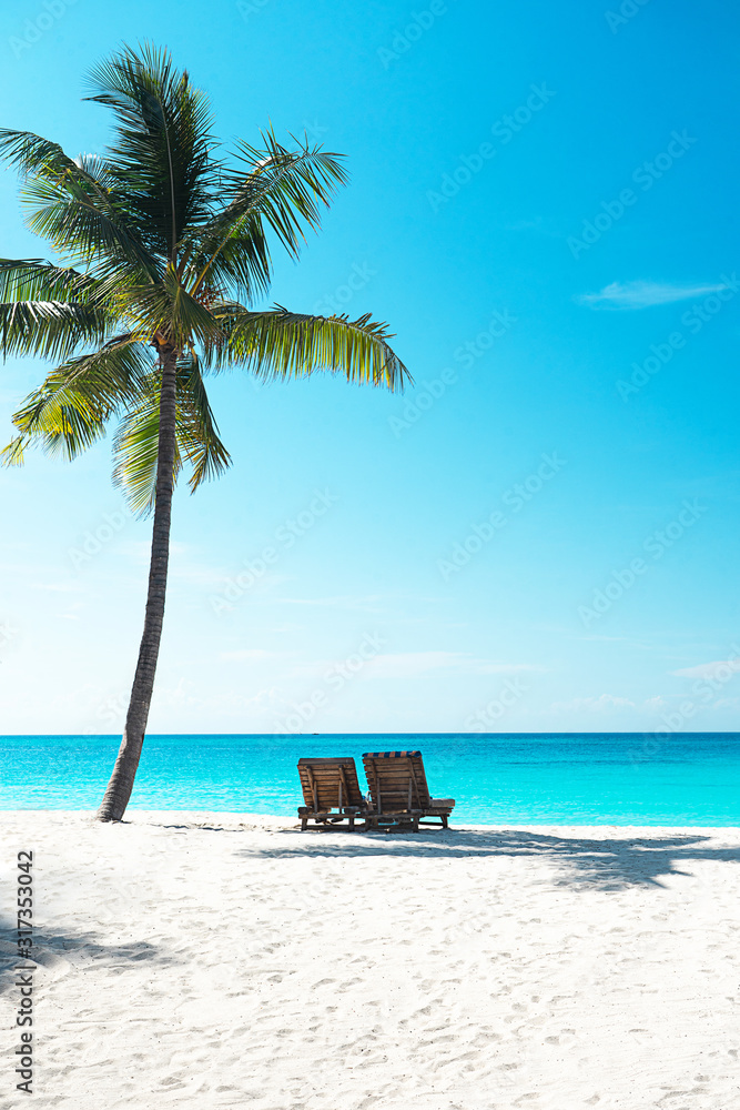 Panoramic view of a beautiful sunny day on sandy beach on exotic island.