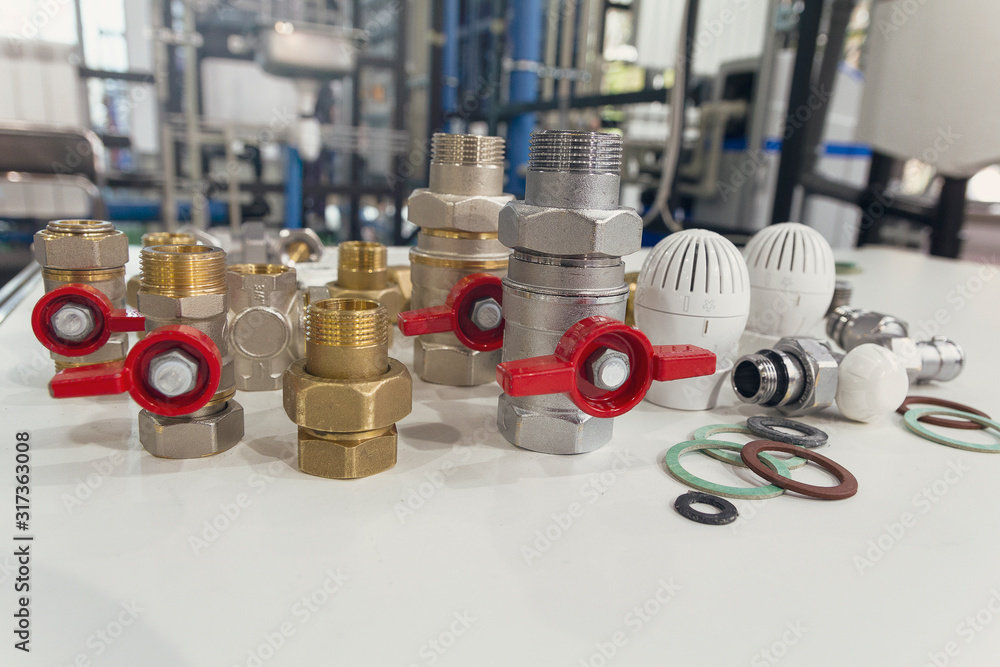 Water valves, fittings and thermostats on the table on the background of other heating equipment