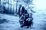 Traveler couple with map, compass and backpack exploring forest. Freedom and active travel concept.