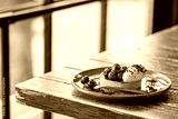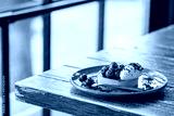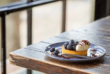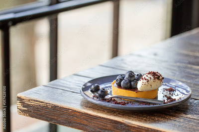 Tart with chocolate, cheese and berries. Breakfast is sweet with blueberries. Beautiful tasty dessert on the table. Vegetarian dessert with blueberries. Dessert on a saucer. Chocolate dessert