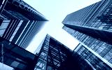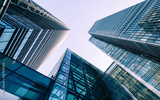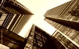 London Docklands skyscrapers. Low, wide angle view of converging glass and steel contemporary skyscrapers.