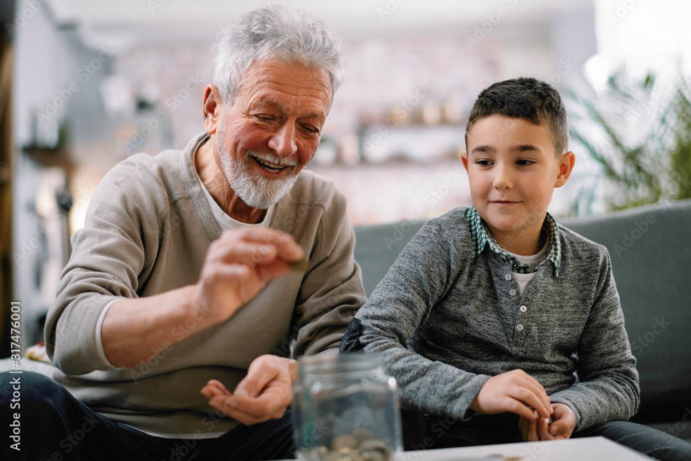 Grandpa and grandson saving money. Grandfather teaching grandchild how to save money.