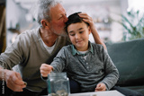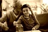 Grandpa and grandson saving money. Grandfather teaching grandchild how to save money.