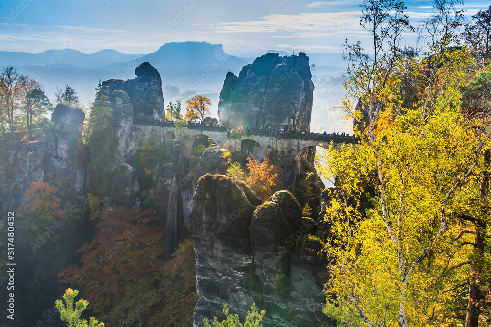 The Bastei bridge, Saxon Switzerland National Park, Germany in autumn