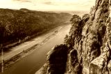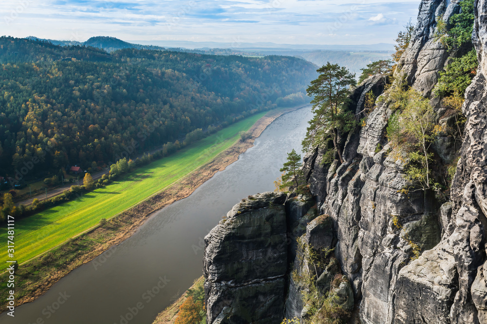 View from the viewpoint from the Bastei bridge on the river Elba. Saxon Switzerland National Park in autumn