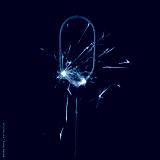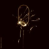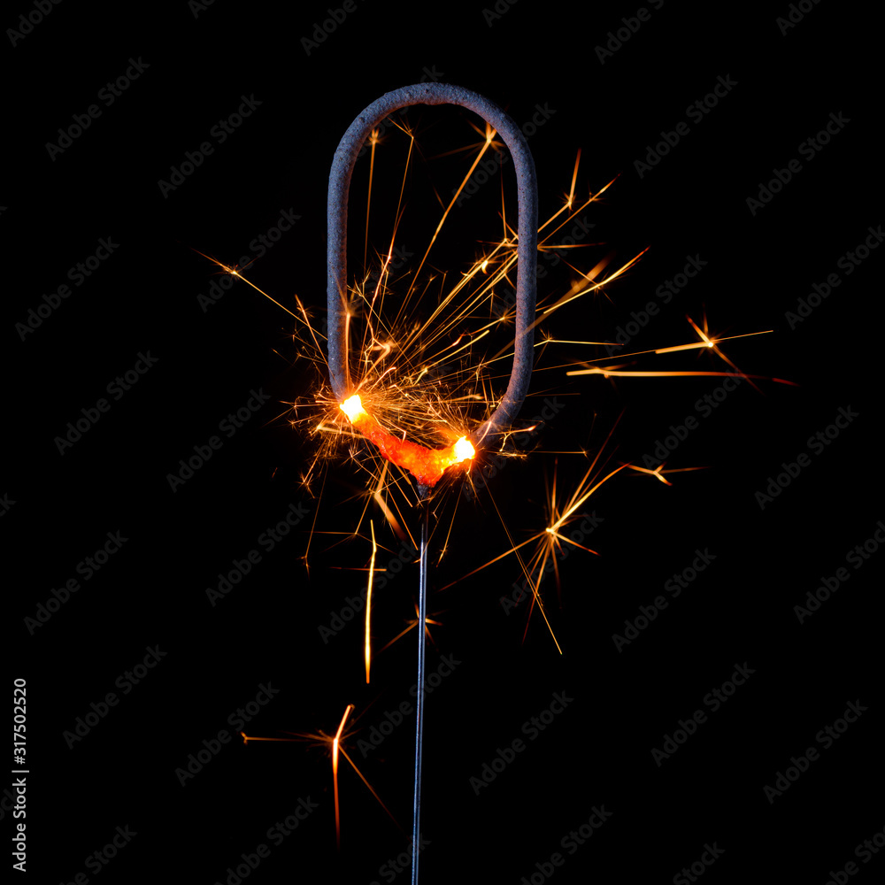 Burning sparkler in shape of number zero, digit 0, isolated on black background.