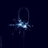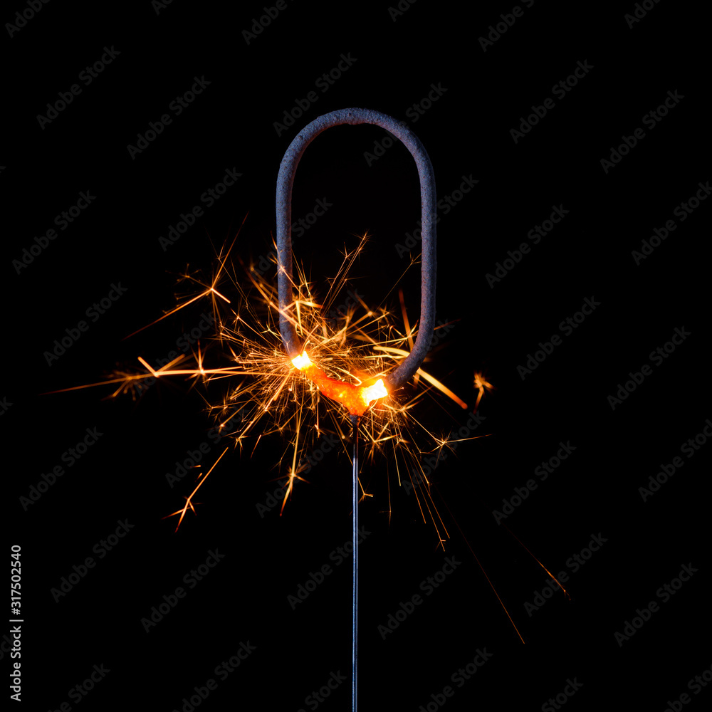 Burning sparkler in shape of number zero, digit 0, isolated on black background.