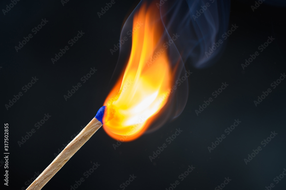 Wooden match stick with blue head ignited and burning bright big fire on black background.