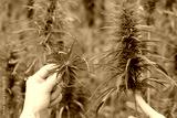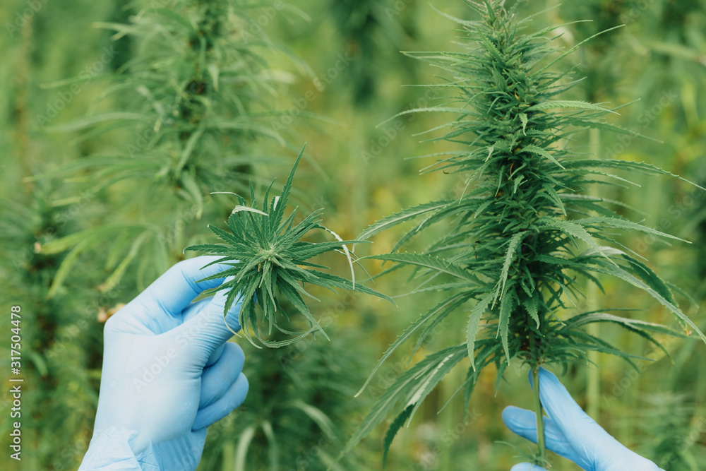 Scientist show hemp plant top on field