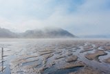 Coast of the ocean in milky fog with water puddles and streams during ebb
