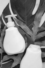 Blank white cosmetic products on a marble background with tropical palm leaf