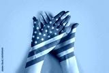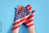 Female open hands painted in american flag colors. Independence Day, freedom, friendship, unity concept. USA flag, labor concept