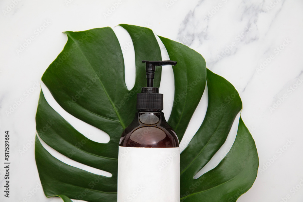 Cosmetic product bottle with blank label on a tropical leaf