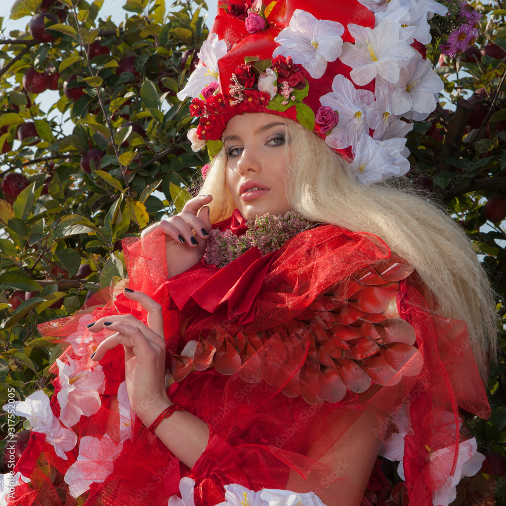 Sensual blond girl in fantasy red fairy tale stylization in apple park.