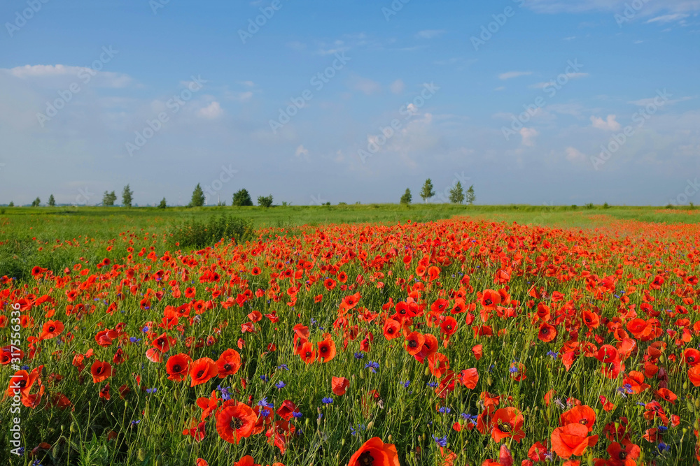Field with wild poppy on a sunny morning in Ukraine. Copy space.
