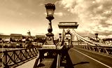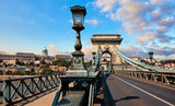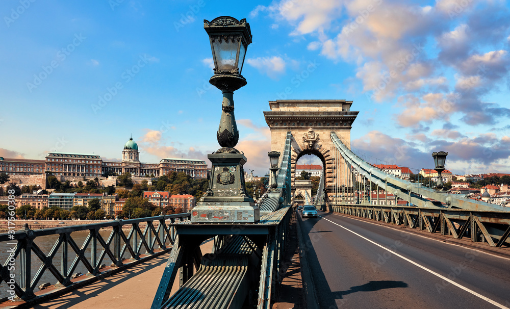 Chain bridge in Budapest, Hungary. View at Royal castle at Buda district over Danube river. Antique lanterns street lamps along road and stone arcs. Summe urban landscape with blue sky and clouds.