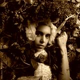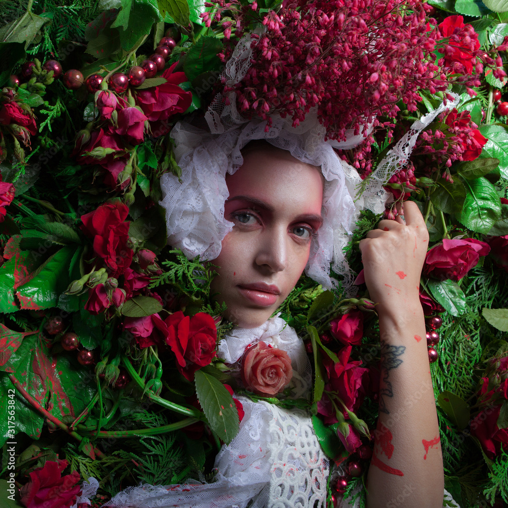 Female portrait in fairy tale stylization surrounded with natural flowers.