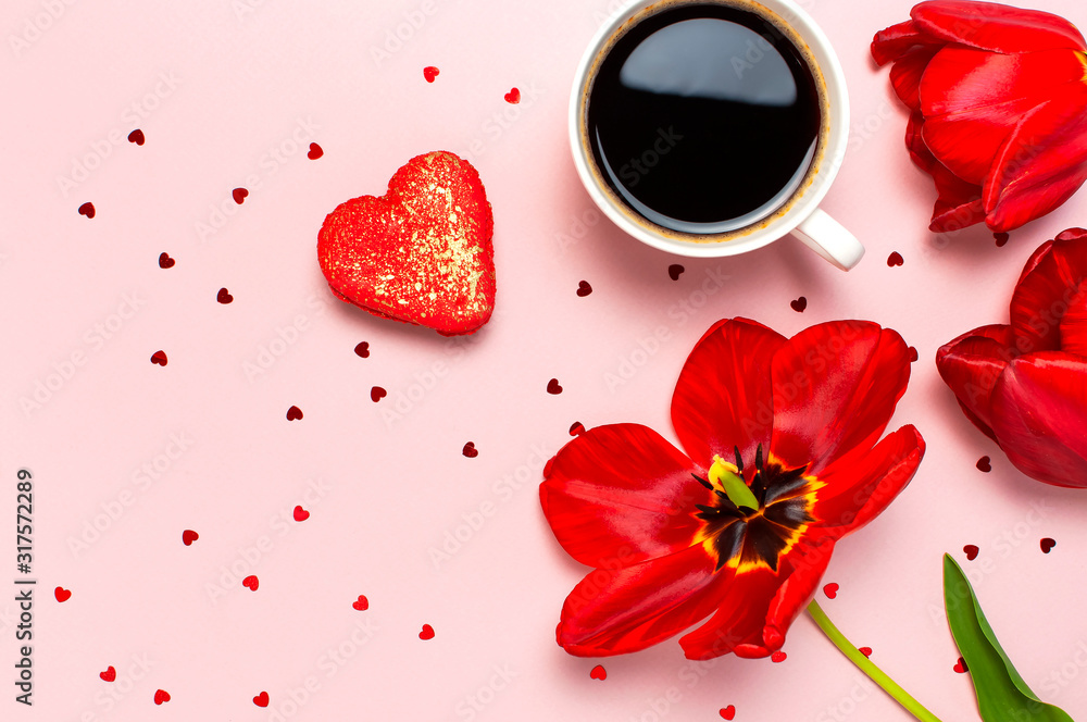 Red tulips, red heart shaped gift box, cup of coffee, macaron cake, confetti on pastel pink background top view Flat lay. Mother's Day Valentines Day birthday holiday background. Lovely greeting card