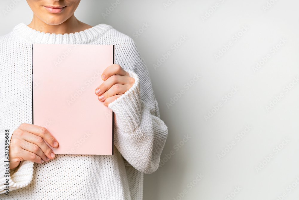 Close view of woman in white woolen sweater holding a book with empty pink cover in hands. Free space for your mock up of reading book concept background.