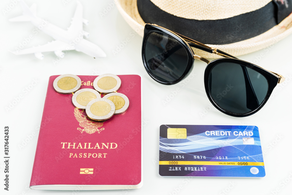 Passports and credit cards,sunglases,airplane on white