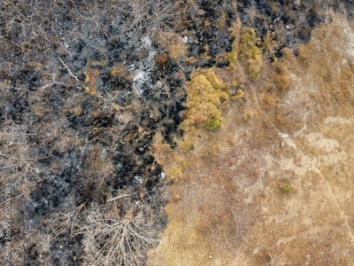 Aerial view, Orange and yellow dry forest, Some parts were destroyed by a forest fire.