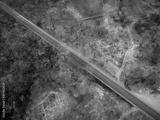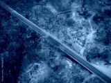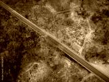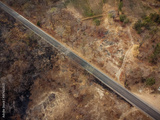Aerial view, The road passes through a dry orange-yellow forest. Some parts were destroyed by a forest fire.