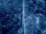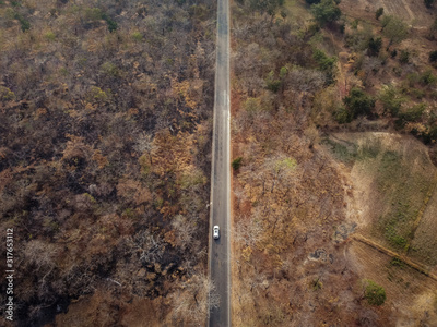 Aerial view, The road passes through a dry orange-yellow forest. Some parts were destroyed by a forest fire.