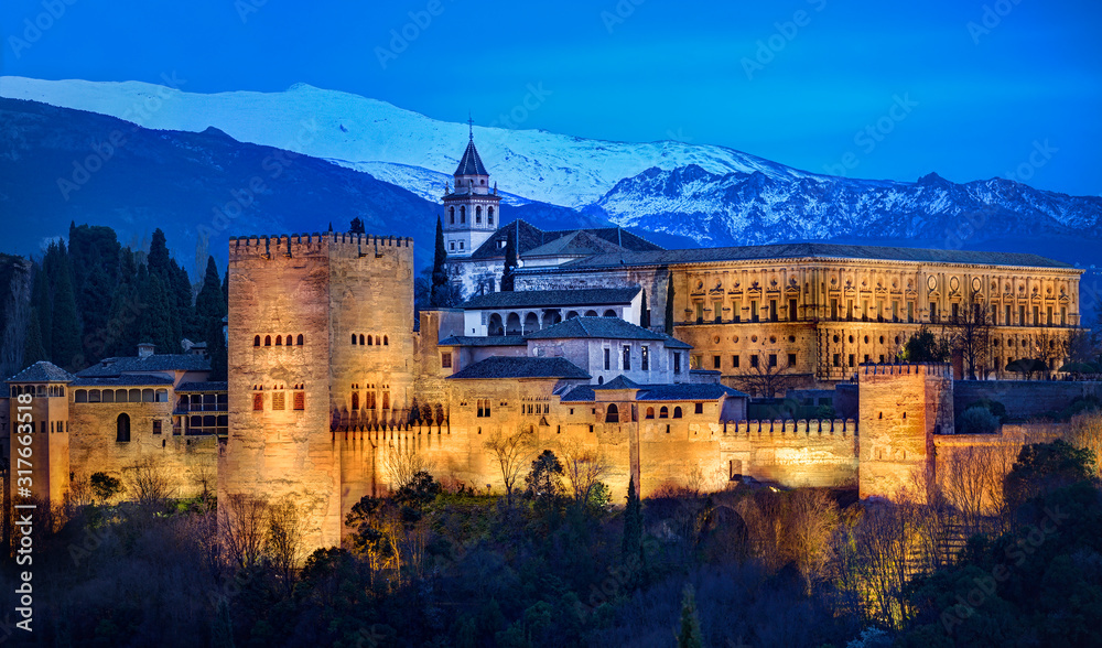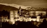 Al Hambra Illuminated at Night, with Sierra Nevada in the Background
