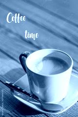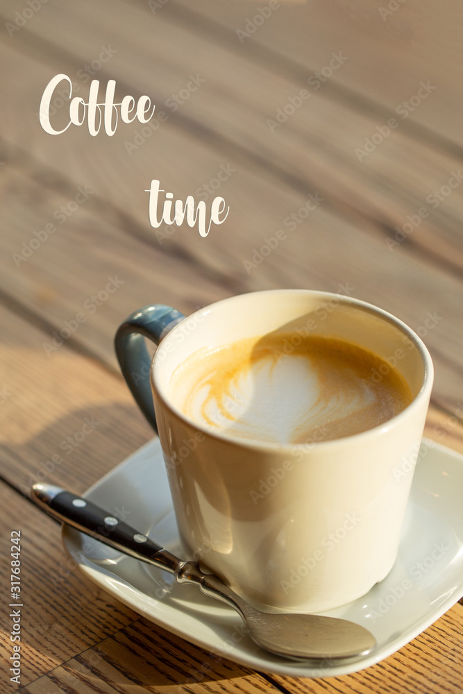 Coffee time. Latte on a wooden table with sun rays. Hot coffee by the window. A cup of hot milk. Cappuccino on a saucer with a spoon. Time for yourself. Relaxation