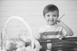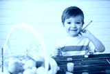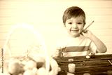 A little boy painting and decorating Easter eggs. Portrait of cute boy 3 years old. He holds brush and paints Easter eggs