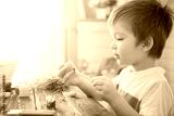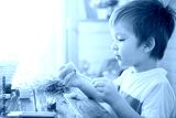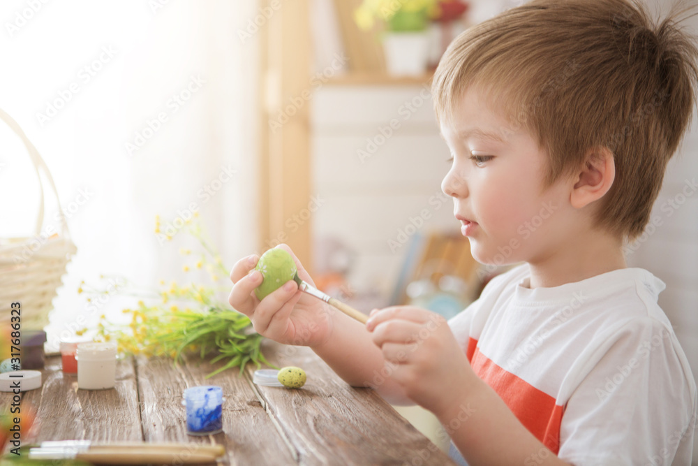 Boy holds an egg and painting with brush. Preparing for celebration of Easter. Little boy painting and decorating Easter eggs.