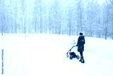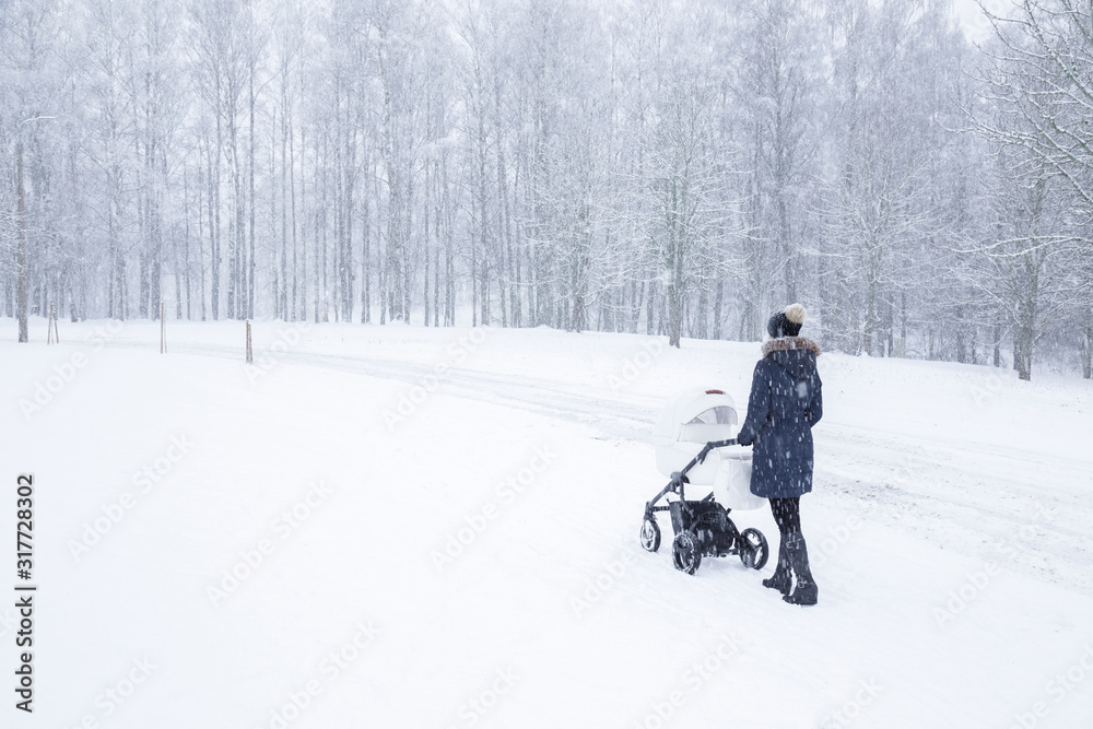 Young mother pushing baby stroller and walking at nature park. Snow covered trees. Spending time with infant in beautiful snowy winter day. Enjoying peaceful stroll. Back view.