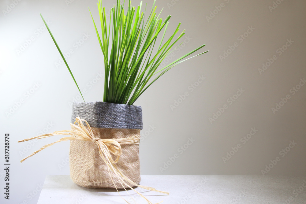 Fili d'erba, in sacchetto di juta con nastro di rafia, isolato su fondo chiaro