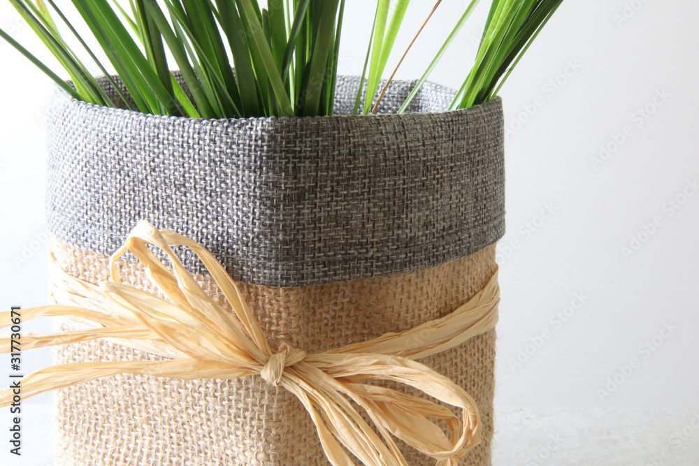 Fili d'erba, in sacchetto di juta con nastro di rafia, isolato su fondo chiaro; dettaglio