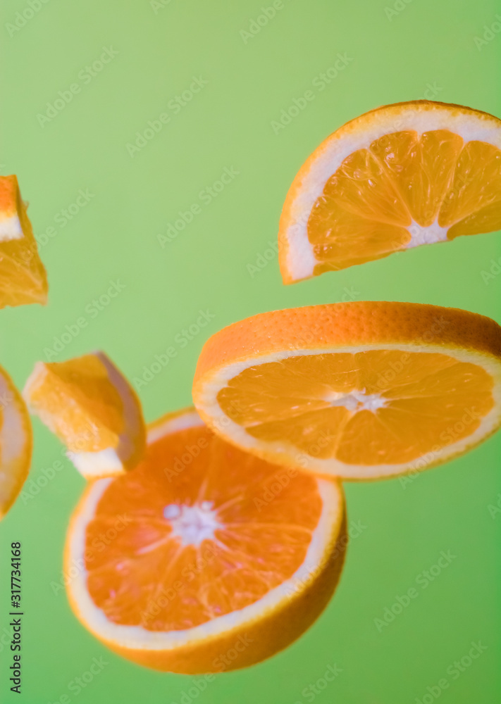 Green bright background and pieces of orange in air. Healthy and useful nutrition. Fruit and citrus. Vitamin C. Diet.